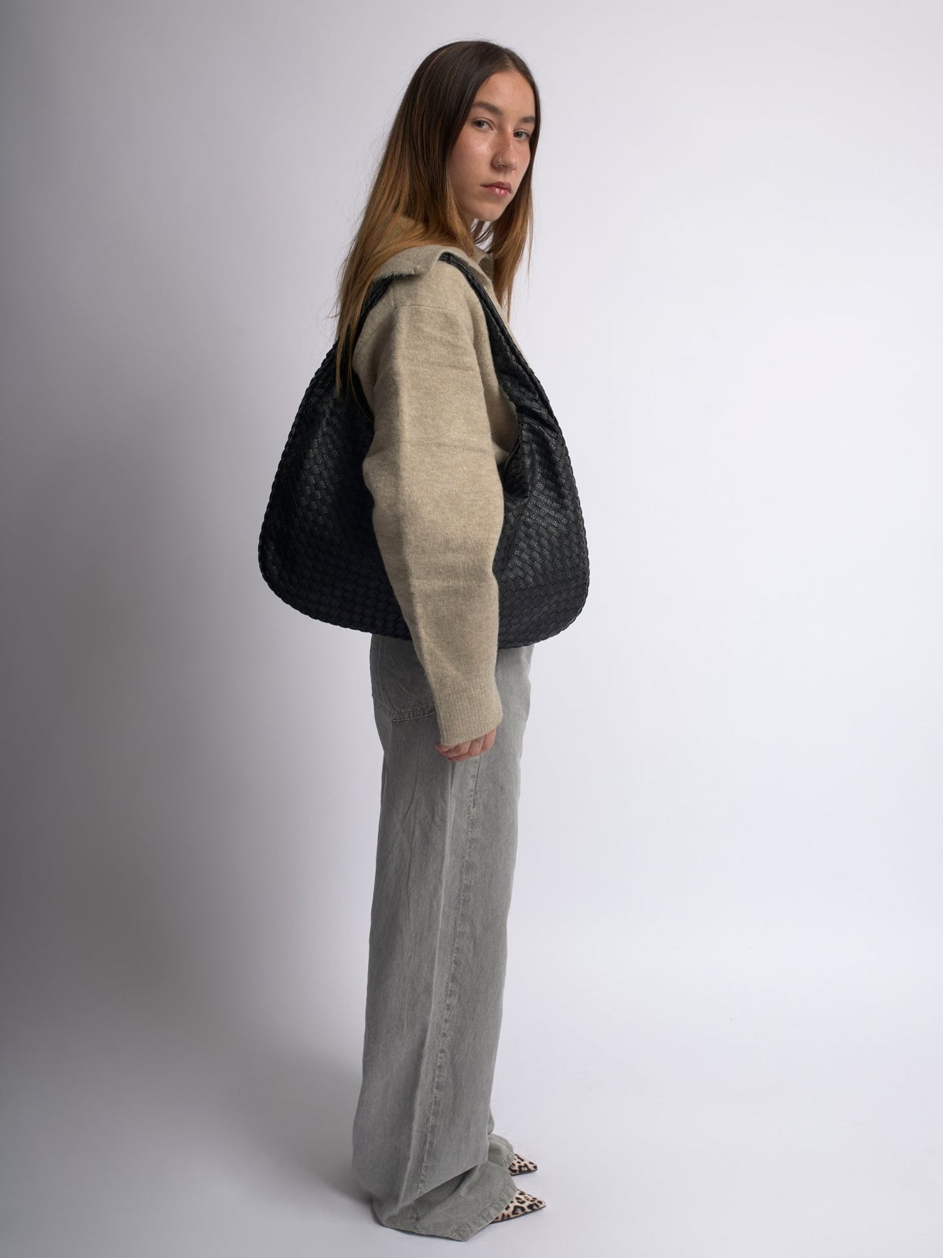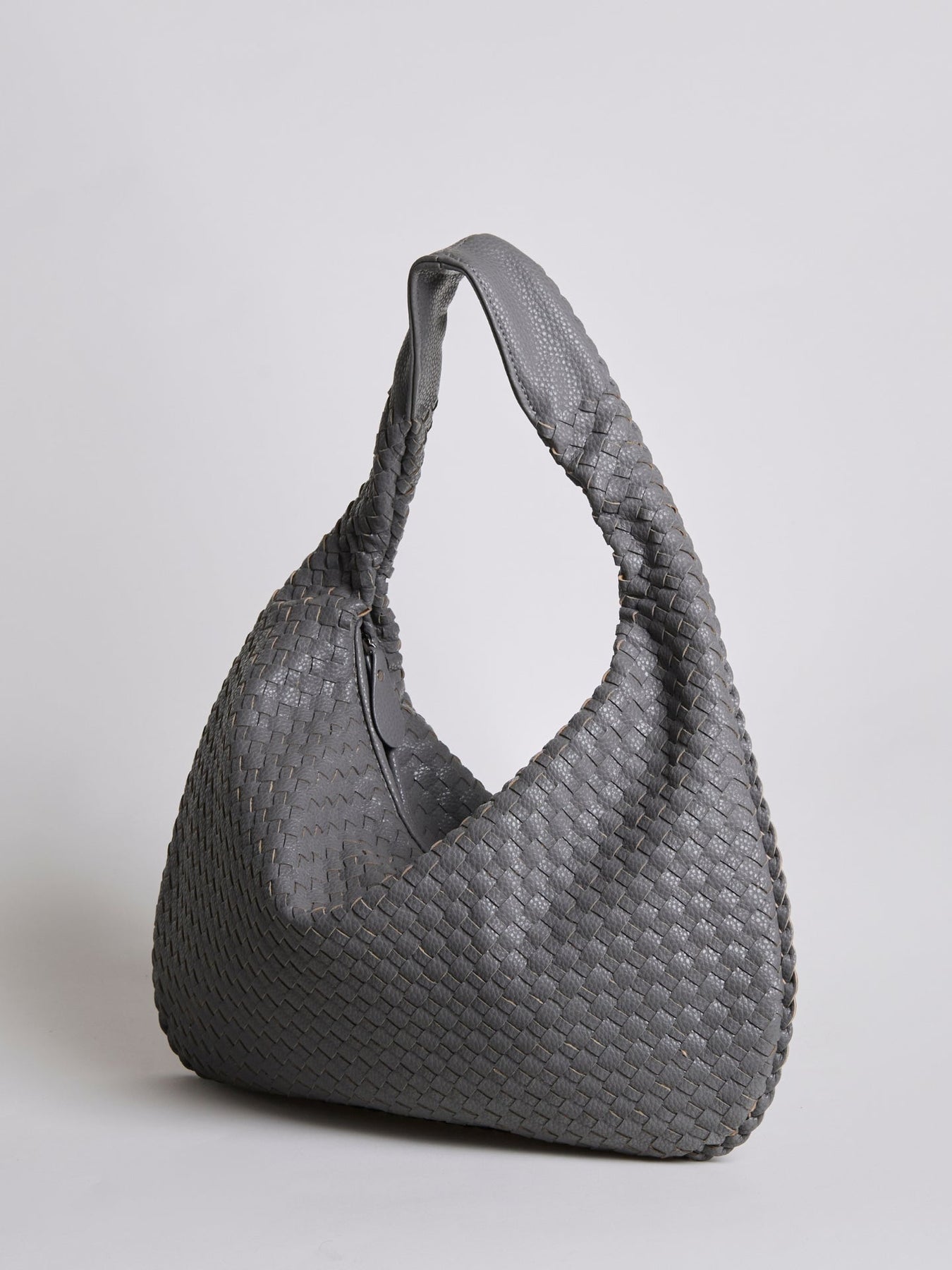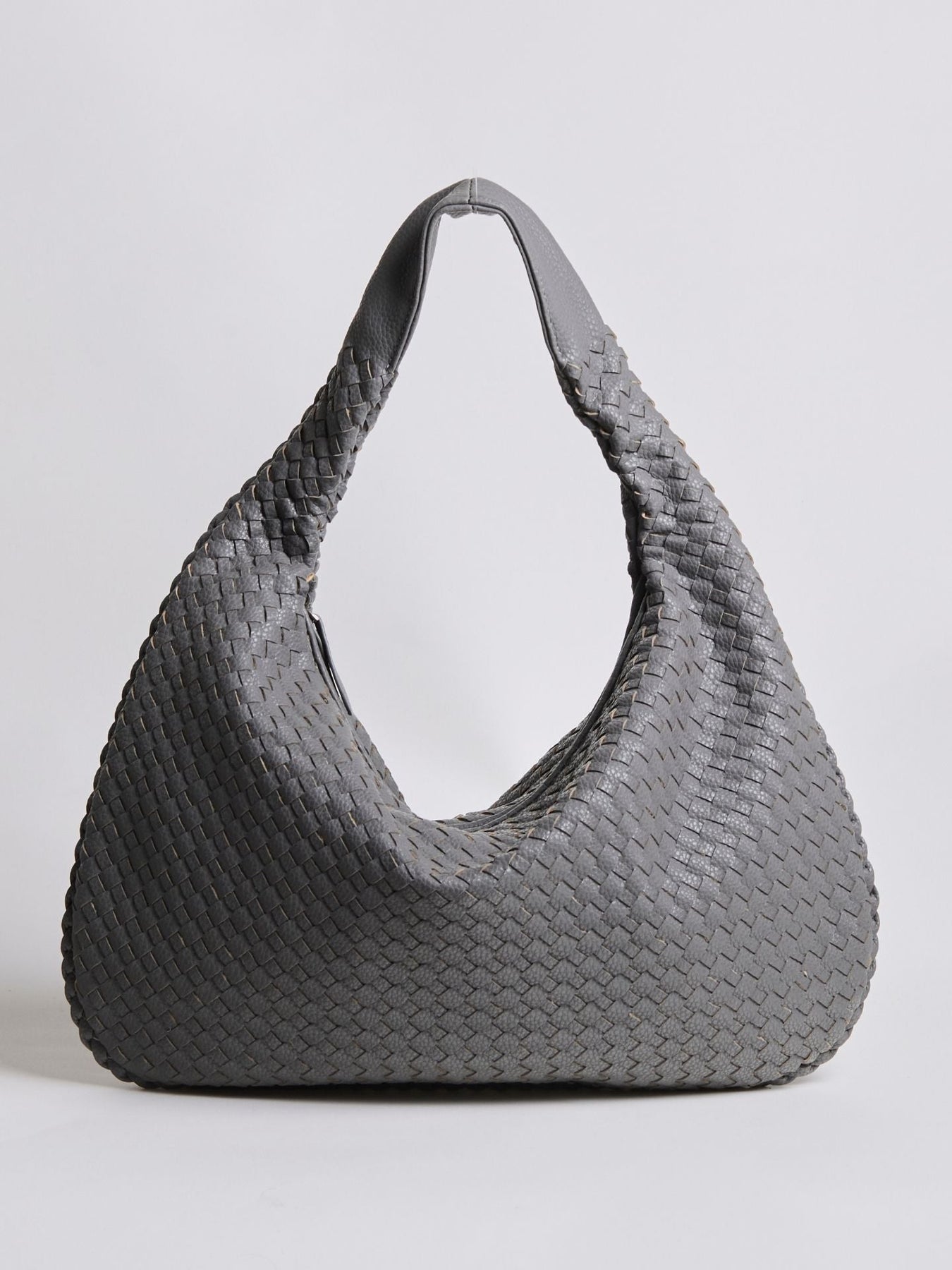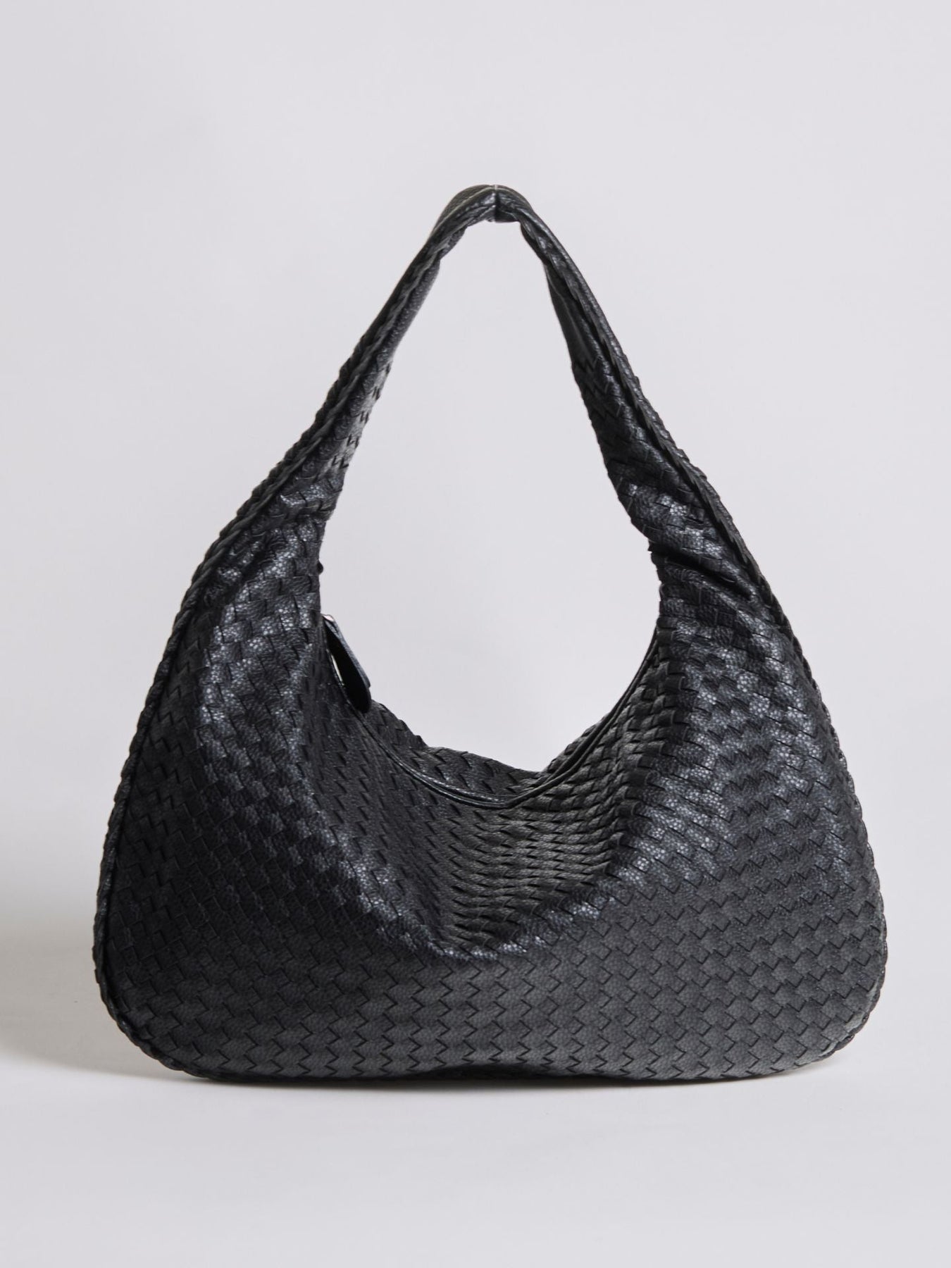 • Bolso bandolera con forma de media caña y diseño trenzado
